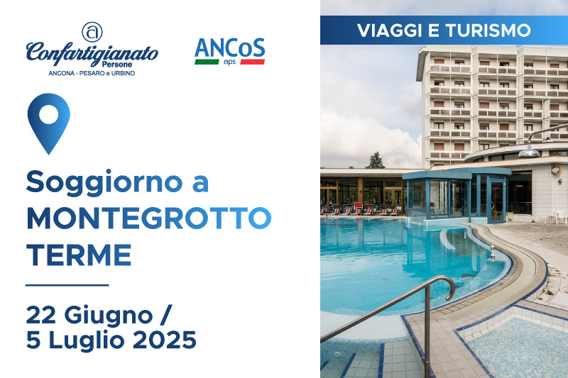 Marzo 25, 2025 Marzo 25, 2025VIAGGI e TURISMO Soggiorno Montegrotto Terme, 22 giugno al 5 luglio 2025Dal 22 giugno al 5 luglio 2025, Confartigianato Persone Ancona – Pesaro e Urbino, in […]