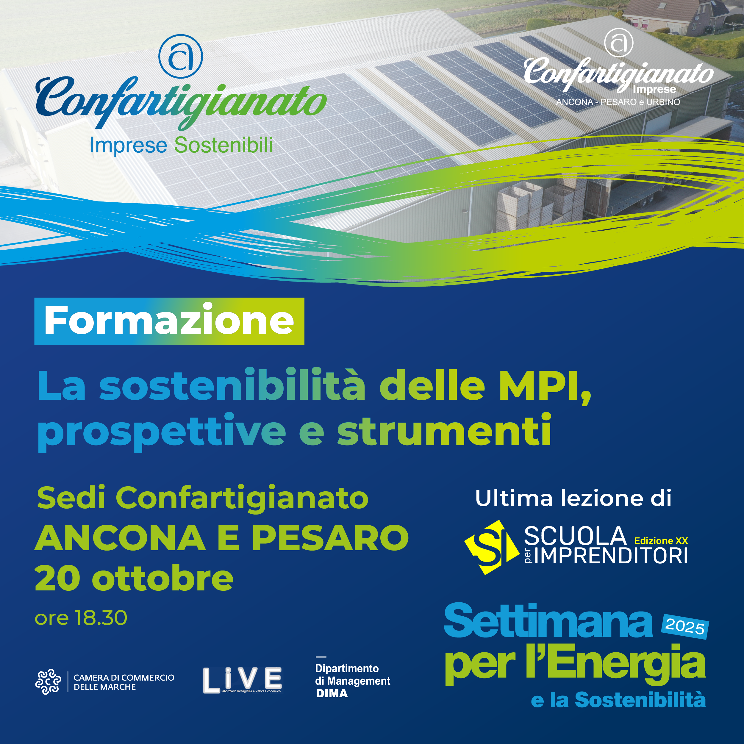 In occasione della Settimana della Sostenibilità di Confartigianato, si conclude il percorso formativo della XX Scuola per Imprenditori, 'Come trasformare le criticità in opportunità',  con un incontro dedicato a comprendere come la sostenibilità, da semplice tendenza, sia oggi un vero e proprio fattore strategico di competitività per le imprese.